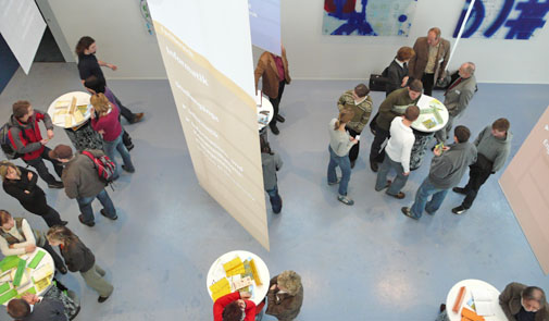 Die Stehtischtonnen sind den Fahnen zugeordnet und bilden mit diesen eine Einheit. Dem Besucher erschließt sich leicht erkennbar das für die Beratung zuständige Personal.